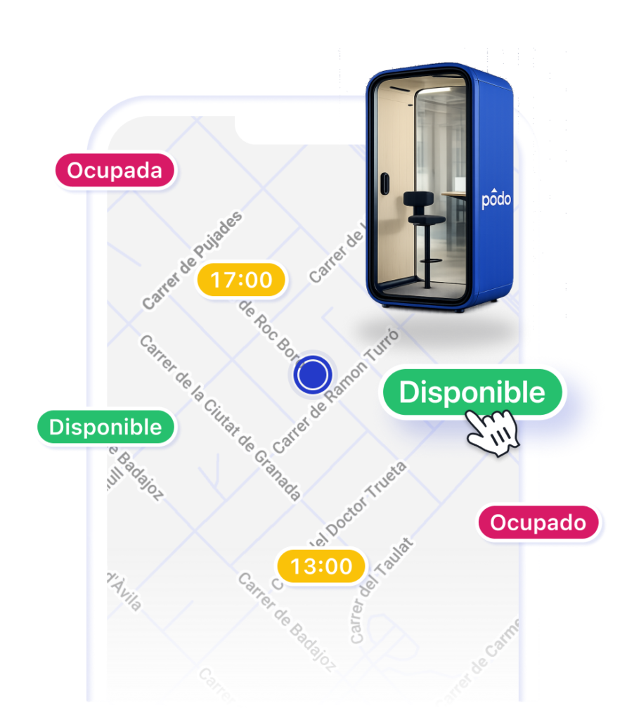 Una red de cápsulas privadas e insonorizadas, ubicadas en espacios premium, para trabajar o hacer videollamadas con total privacidad. Las encuentras cerca, reservas desde la app y accedes con tu móvil.